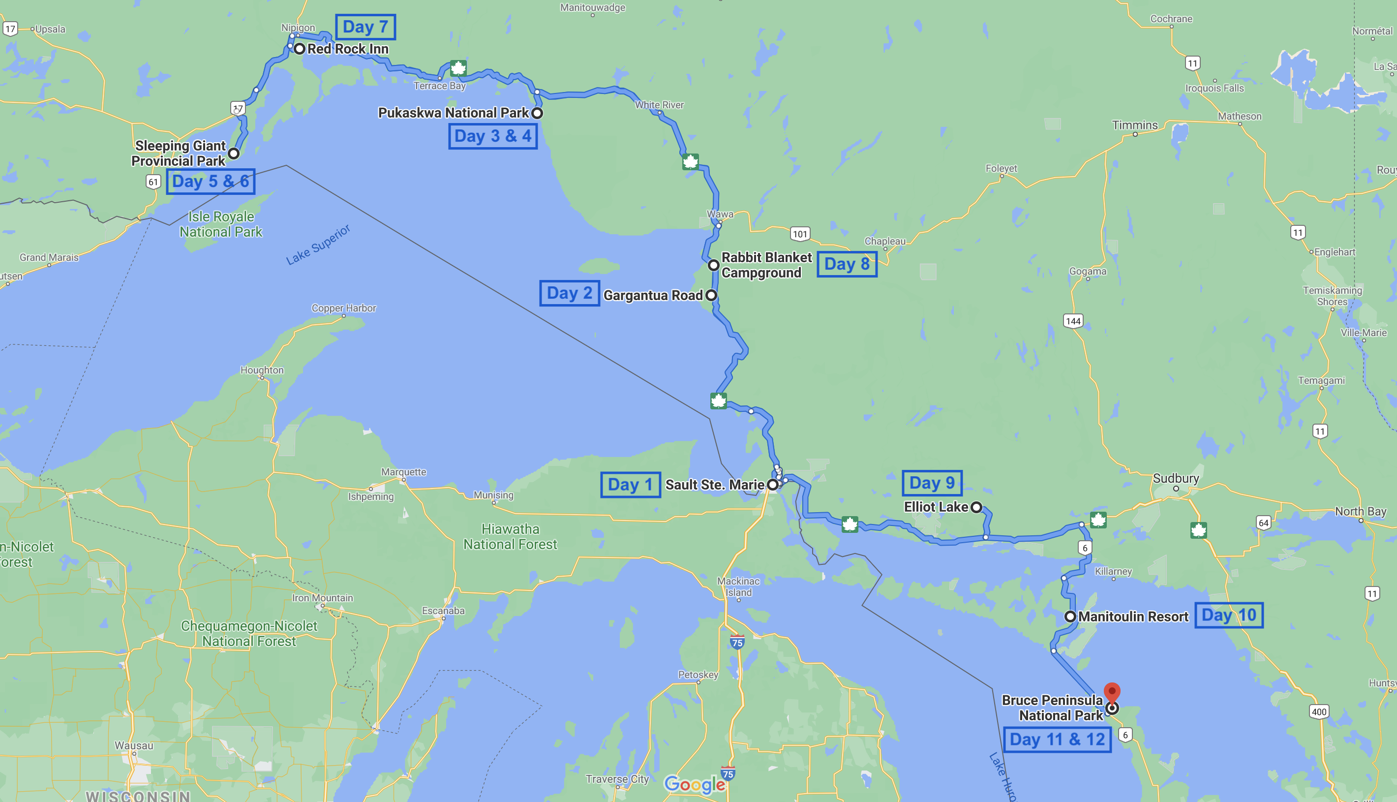 Pancake Bay Lookout: ~50 minute drive from Sault Ste. Marie to the start of the 7km return lookout trail.