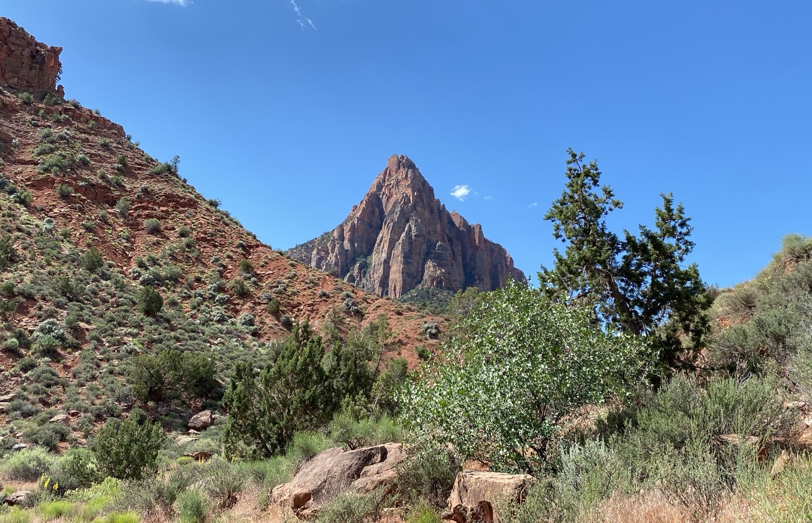 The viewpoint at the top offers beautiful vistas of Watchman Peak and the surrounding canyon. Important note: the trail doesn't actually take you to the peak's summit. There's no trail up there, so this is the closest you can get.